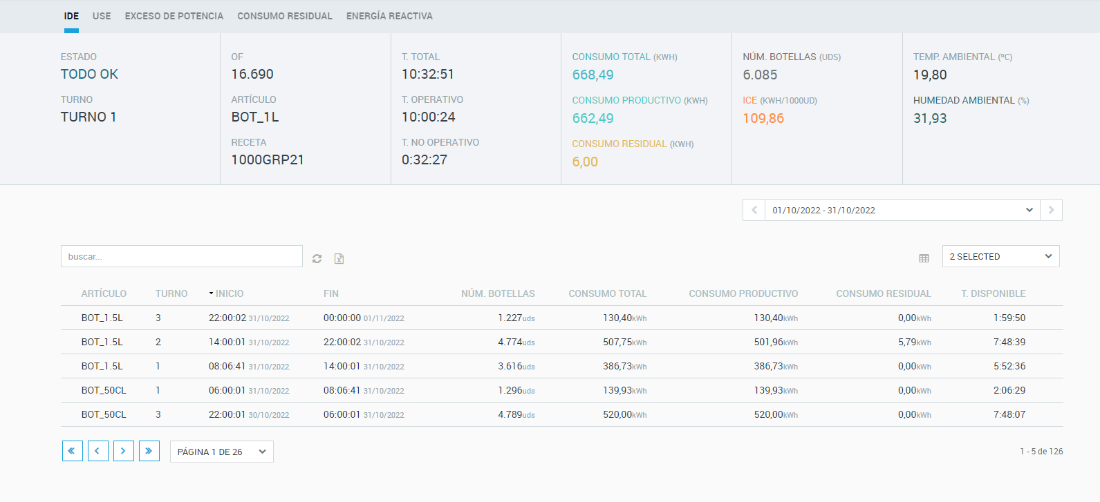 - El consumo energético por artículos, turnos, productos, etc. para identificar desviaciones y funcionamientos anómalos que llevan a tu empresa a tener mayores consumos.