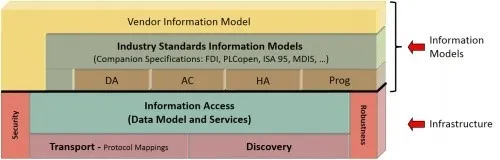 Los denominados “Information Models” se superponen en capas sobre esta infraestructura. OPC UA especifica una serie de modelos de información base (DataAccess – DA, Alarms&Conditions – AC, y más) que definen objetos de uso común, incluidas alarmas y variables de datos históricas y en tiempo real.